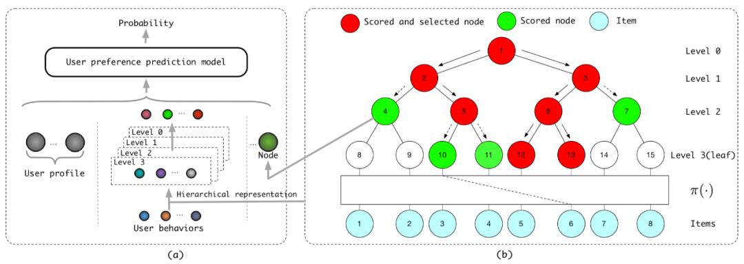 如图 (b) 所示。树上的非叶子节点可以看做是它的子节点集合的一个抽象。图 (a) 给出了用户对节点的偏好概率的计算过程,用户信息和待打分的节点首先被向量化为深度打分网络 ( 例如,全连接网络,attention 网络等等 ) 的输入,网络的输出作为用户对该节点的偏好概率。在检索 top-k 的候选子集即 top-k 叶子节点的过程中,我们采用自顶向下的逐层 beam search 方法。在第 l 层中,我们只对第 l−1 层被选中的k个节点的子节点进行打分和排序来选择第 l 层的 k 个候选。图 (b) 给出了检索过程的示意。