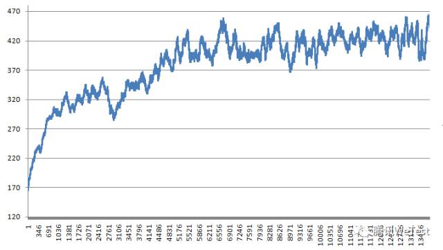 系统采用特定算法对模型进行训练。训练结果如下图,横坐标是玩的游戏局数,纵坐标是一局跑的里程数。整个训练过程共进行了上万局游戏,随着训练的次数增多,每局的里程数也在上升。