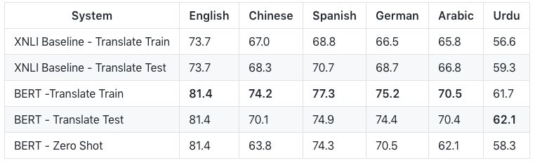 Zero Shot 表示多语言BERT模型在英语MultiNLI上进行了微调,然后在外语XNLI测试集上进行了评估。在这种情况下,预训练和微调的过程都不涉及机器翻译。