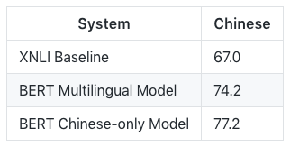 前两行是XNLI baseline的结果,后三行是使用BERT的结果。