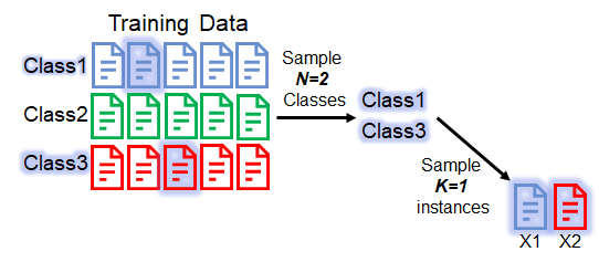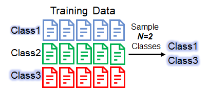 We sample N classes from all the classes in the dataset. (Please note: here we use N=2 just for the purpose of demonstrating. It doesn't mean in practice N=2 is a good setting. Please find how many classes exactly sampled in their paper.)