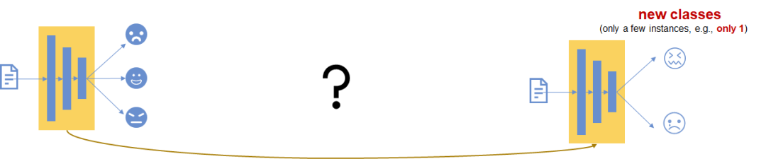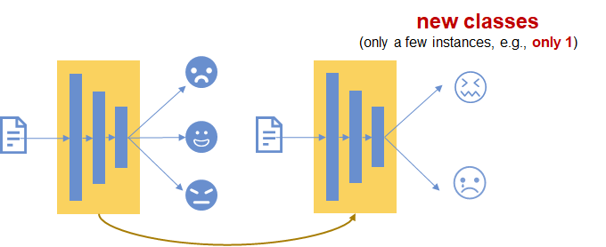All in all, the problem is how to train a model on a dataset that have many instances for each class and how to adapt this model to a new dataset which only has a few instances for each class. The classes in the new dataset are unseen in the first one.