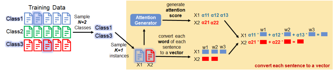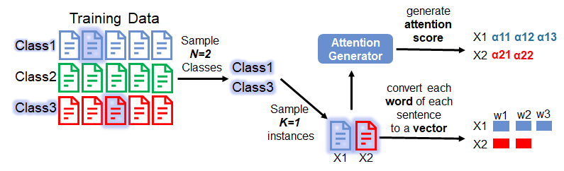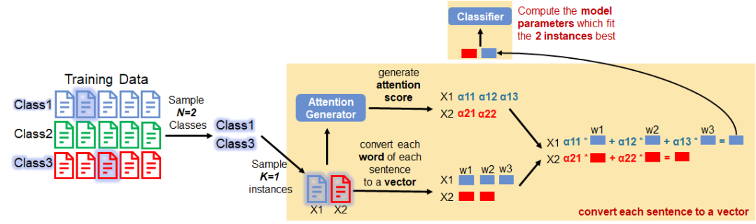 We then feed these vectors to the classifier. Based on the predicted results, we compute the loss function (i.e., cross-entropy) on the instances in the query set and subsequently update the model parameters.