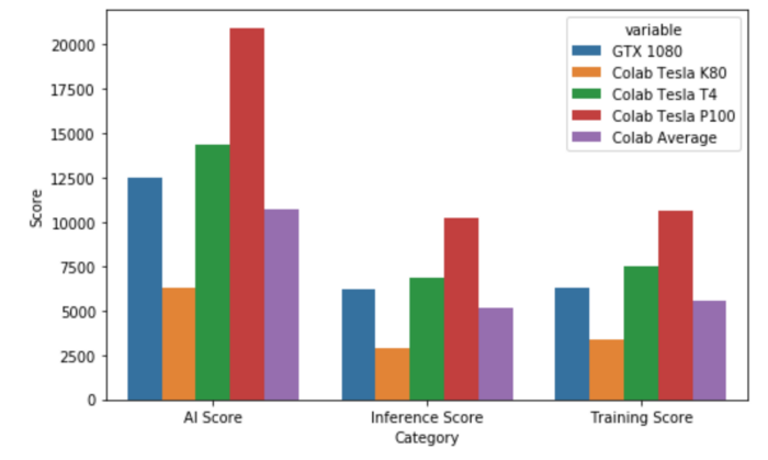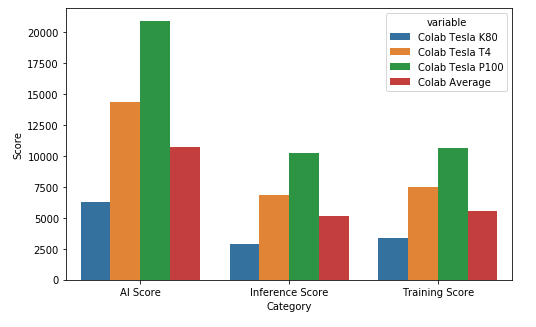 Jeremy DiBattista 就如何对其进行测试进行了说明。和 eGPU 一样,他使用 AI Benchmark 进行测试。这是一个非常简单但功能强大的 Python 库,利用 Tensorflow 框架在 19 个不同的部分上进行了 42 个测试,从而为 GPU 提供了出色的通用 AI 评分。接下来,Jeremy DiBattista 进行了 15 次的初始化,每次使用 AI Benchmark 进行测试,记录结果以及分配 GPU —得到了 K80 十次,P100 四次,T4 一次,Jeremy DiBattista 表示从来没有得到 P4,但是应该比 T4 稍差一点,速度对比图如下图: