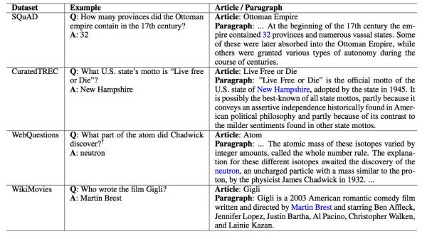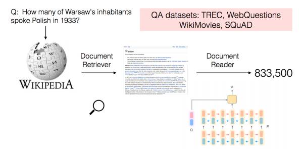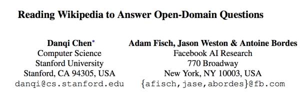 我们以斯坦福和Facebook AI Research17年较新的这篇文章Reading Wikipedia to Answer Open-Domain Questions为例,进行介绍。