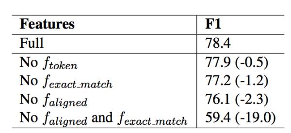 可以看出,作者提出的这个document reader模型,在阅读理解领域效果也很不错。我们注意到,在这里作者也分析了token的四种feature对实验的影响,结果如下表:
