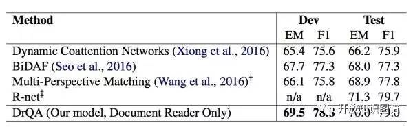 作者也用document reader在SQuAD上进行阅读理解任务的性能测试,与上面测试不同的是,上面是通过检索维基百科中的文章进行回答,而该测试是直接给定相关的段落,作者与其他的state-of-art方法进行了比较,效果如下:
