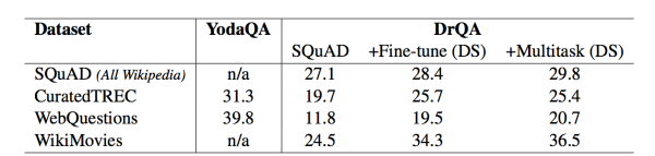 对于document reader,作者使用h=128的3层双向LSTM,0.3的dropout以及Adamax作为优化器进行训练,并比较了 1)只在SQuAD上训练,和2)先在SQuAD上预训练,再单独在三个QA数据集上进行远程监督训练fine-tune(+Fine-tune)以及3)在四个数据集上进行多任务训练的 测试结果——Top-1 exact-match 正确率,如下表所示: