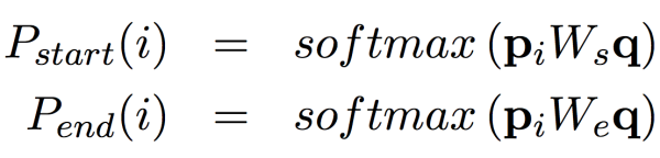 得到了问题和段落的编码,我们就可以进行答案区间的预测了,我们对于段落的每一个位置i,都用两个双线性项去分别预测它作为答案起始位置和终止位置的概率,公式如下: