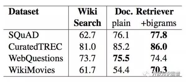 通过问题检索出相关的文章有很多的方法,最简单的方法就是统计两者的TF-IDF得到词袋模型向量,然后通过cosine similarity等相似度度量方式进行检索。进一步可以将相邻词汇也考虑进去,使用n-gram的词袋模型。这篇文章中,作者使用bigram的词袋模型,为了加快效率,将bigram映射为murmur3 hash。