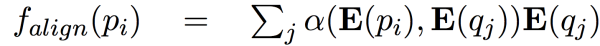其中p代表段落中的token,q代表问题中的token,E表示embedding,alpha是二者点乘后的归一化相似度,即: