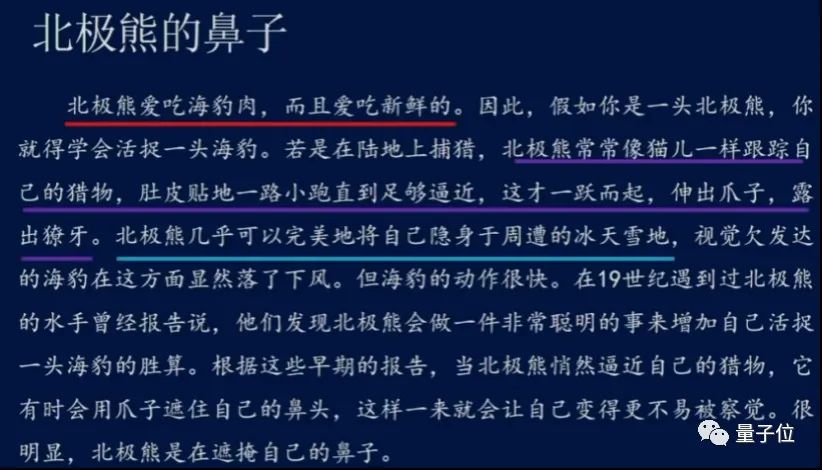 认知科学领域上世纪90年代开始的具身革命,为多模态研究提供了认知基础。具身(Embodied,也译为“体验”)模拟假说认为思考以及使用语言的能力,并非只和头脑相关,而是我们的肉身与头脑合作的成果。这里的肉身就包括声音、视觉、味道、气味、触感和运动等模态。不断有巧妙设计的认知实验,以及利用精密的眼动仪器和fMRI的实验结果,提供证据支持这一假说。正如,本杰明·博根教授在他的著作《我们赖以生存的意义》中的举例(如图2),当看到“北极熊爱吃海豹肉,而且爱吃新鲜的”这个句子,一刹那,我们的脑袋里很可能会浮现出北极熊和海豹的样子;看到“它爱吃新鲜的”,我们可能会有一点要流口水的感觉;当我们看到文字描写北极熊是怎么捉海豹的,讲到了它“一跃而起,伸出爪子,露出獠牙”,则很可能有一种想张嘴伸出手的冲动。这些都与我们对文字所描述的景象进行了多模态的模拟相关。
