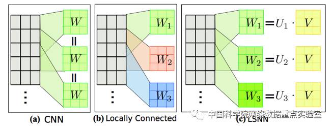 局部平滑神经网络和局部连接神经网络一样,在不同的局部区域,会有不同的参数,但是对于局部平滑神经网络而言,相邻的局部区域间的参数被一个空间分布所约束。我们将所有的参数看做W,那么在卷积神经网络中所有局部区域的W是相同的,在局部连接神经网络中所有局部参数是独立的,而在局部平滑神经网络中W是由一个空间分布函数U和一个共享的局部算子V共同决定的。