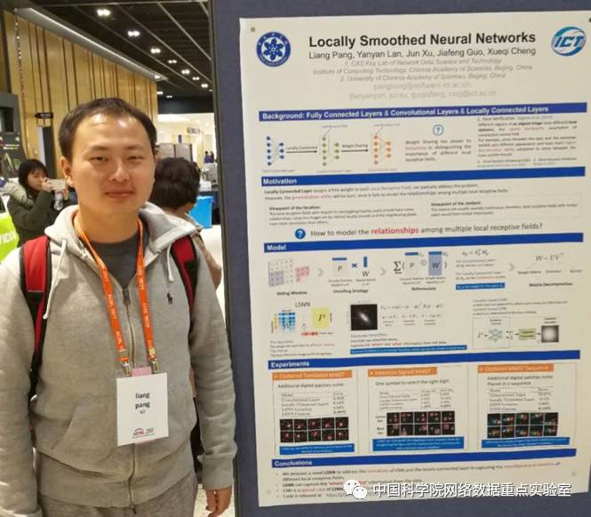 2017年11月17日,在韩国首尔举行的ACML 2017 会议上,中科院计算所网络数据科学与技术重点实验室程学旗老师团队的博士生庞亮(导师:李国杰院士和兰艳艳副研究员)发表了题为“Locally Smoothed Neural Networks”(作者:庞亮,兰艳艳,徐君,郭嘉丰,程学旗)的论文并作了大会报告。本届ACML会议共收到稿件172篇,录用41篇(录用率23%)。