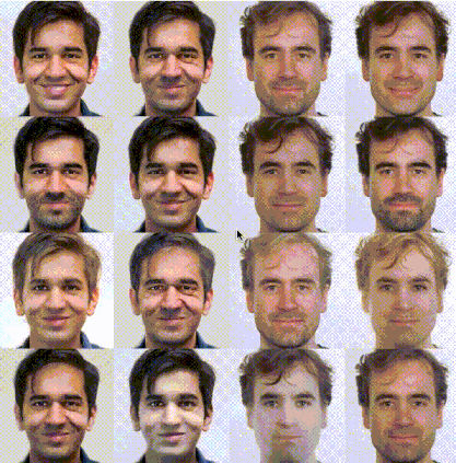 以上是研究者Prafulla Dhariwal和Durk Kingma的面部表情特征变化图。模型在训练时并没有被给予属性标签,但是它学会了一种隐藏空间,在其中特定的方向对应不同特征的变化,例如胡子的茂密程度、年龄、发色等等