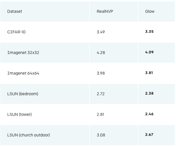 利用这种技术,我们在标准上比较了RealNVP和我们的Glow,RealNVP是在这之前表现最佳的流式生成模型。结果如下: