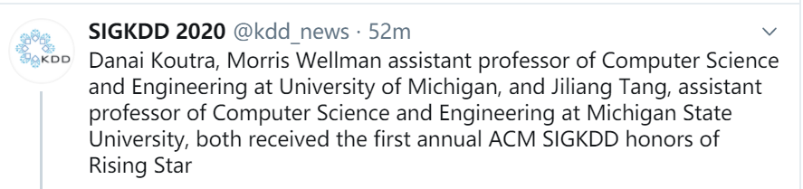今年一共有两位学者获得,分别是Danai Koutra(Morris Wellman)和汤继良(Tang Jiliang)。