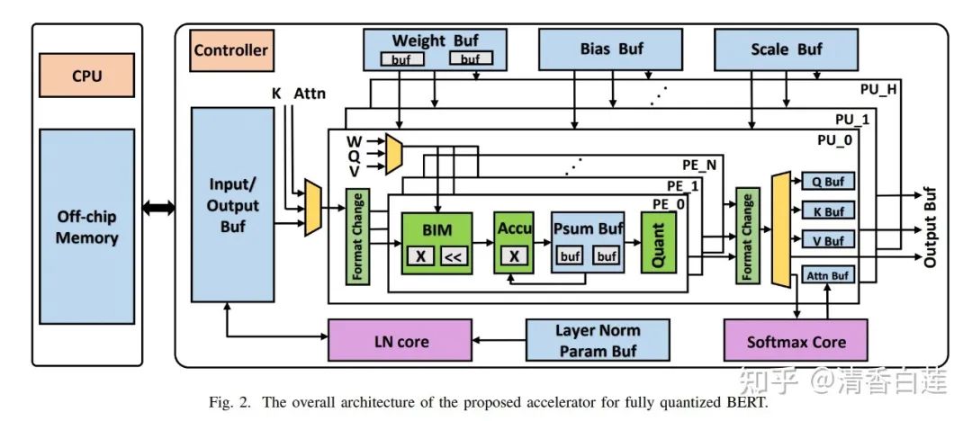 FPGA 本身的主频非常低,跟 CPU 差远了,而且存储资源非常小,数据吞吐能力差,完全用 FPGA 实现一个 BERT 模型理论上不是不行,但肯定是土豪的玩具。一个折衷的办法是与 CPU 协同工作,把 CPU 不擅长且 memory cost 较低的矩阵计算任务交给它,也就是 BERT 中的 Encoder 层,CPU 主要处理 Embedding 层与 Task Specific 层。当然,由于 FPGA 的 memory 限制,需要把 BERT 模型量化成 Integer Only BERT,整个系统的架构如下: