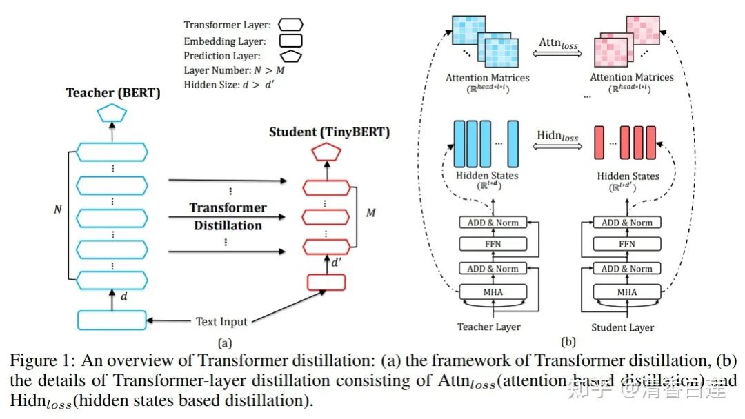 BERT 的蒸馏方法已经有过很多研究,如 BERT-PKD、DistilBERT 以及 TinyBERT 等,这些方法的卖点主要在 loss 的设计上。这里介绍下 TinyBERT 的 Loss 设计,应该说考虑的比较全面主要包含三大块:Attention Loss,Hidden Loss 与 Embedding Loss。