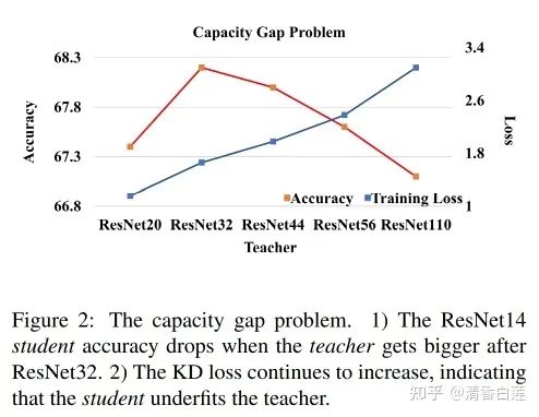 在知识蒸馏问题中,并非 Teacher Model 越好 Student Model 就越好。当 Teacher Model 比 Student Model 大很多时,Capacity Gap 问题将会变得非常严重。下图中的 Student Model 都是 ResNet14,当 Teacher Model 的体量超过 ResNet32 时,蒸馏的结果却出现了明显的 drop。同时 KD Loss 随着 Teacher Model 的增大而不断增加,说明 Student Model 对 Teacher Model 的模仿能力或者拟合程度越来越低。