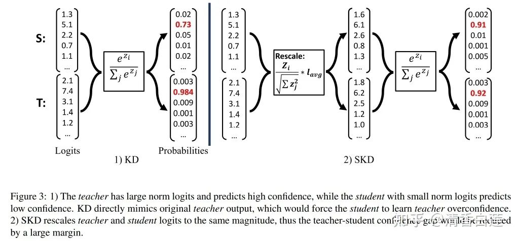 一般随着模型的增大,会对预测的 label 更加 confident,即分配更高的概率。如下图左侧,Teacher Model 对预测的 label 分配的概率时 0.984,而 Student Model 分配的概率是 0.73。而常规的知识蒸馏使用了 Soft Target,即让 Student Model 去学习 Teacher Model 的输出概率分布,然而 Student Model 在体量上的劣势就注定了它很难在这方面向 Teacher Model 看齐。