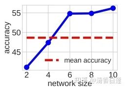 那么 TA 的 size 选多少合适呢?一般并不是选择两者体积的平均,而是在各自单独训练的情形下,性能介于 Teacher 与 Student 之间的网络的 size。例如,在下图重蓝色的折线表示随着模型层数的增加,模型的准确率,如果 Student 是两层,Teacher 是 10 层,那么 TA 应该选 4 层,因为它的性能接近前两者的平均值。