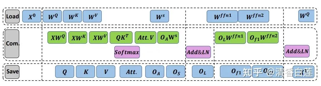 3. LN Core:用于 Layer Normalization 计算,由于 LN 运算中很多 Element Wise 的加乘运算与非线性变换,单独依靠 PE 无法完成,所以针对这部分做了专门的设计。 整个数据流图如下,FPGA 从 off-chip memory buffer 中读取数据,为了减少 FPGA 的数据吞吐量,将每个阶段分成几个子阶段,每个子阶段只加载需要的数据,最后将计算结果写入 goff-chip memory buffer 供 CPU 做 Task Specific 层的运算。