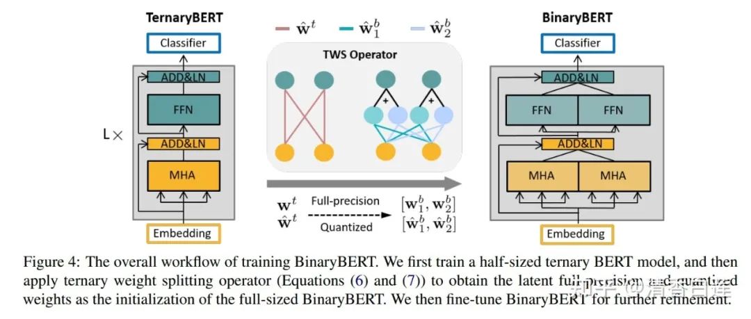 有点类似于用两个 Binary 数据来表示一个 Ternary 数据,所以 BinaryBERT 的 size 也是 ternary BERT 的两倍。