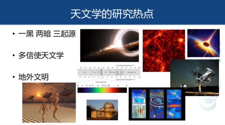 「一黑」就是黑洞,「两暗」是暗物质和暗能量。三起源是什么呢?是宇宙的起源,天体的起源还有生命的起源。这都是我们的终极问题。当然现在一个都没有彻底解决。