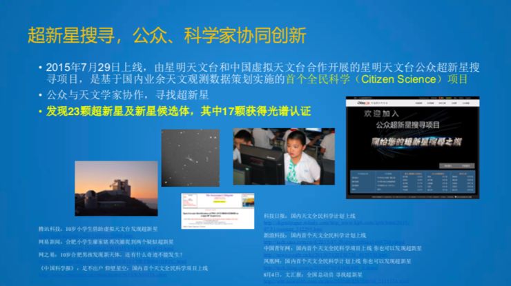 2015年,虚拟天文台和新疆乌鲁木齐一中的一位高中老师合作,打造了一个搜寻超新星的项目。有一个10岁合肥小朋友利用这个平台发现了超新星,成为全球最年轻的超新星发现者。