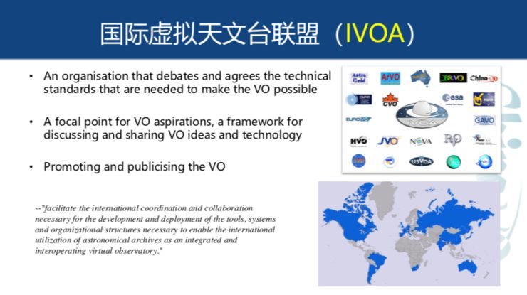 为了推动「虚拟天文台」在全世界的发展,2002年「国际虚拟天文台联盟」成立了。我们可以看到这一个全世界地图,这个地图就是有「虚拟天文台」研究项目的国家在地理上的分布。在大数据的时代,「虚拟天文台」会作为一个基础设施为全世界的天文学家提供服务。