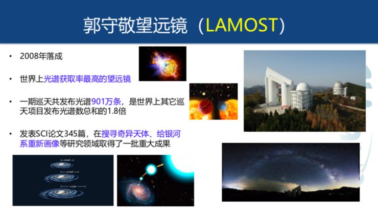 这个望远镜是2008年落成的,是现在全世界光谱寻天效率最高的望远镜,它已经观测了901万条光谱,是世界上最大的天体光谱库。利用郭守敬望远镜的数据,现在已经发表了300多篇高水平论文,在给银河系重新画像等方面产生了一批科学成果。比如以前人类认为银河系只有5万光年大小,而现在通过研究、利用LAMOST的数据把银河系的大小扩大了一倍——银河有10万光年的半径。