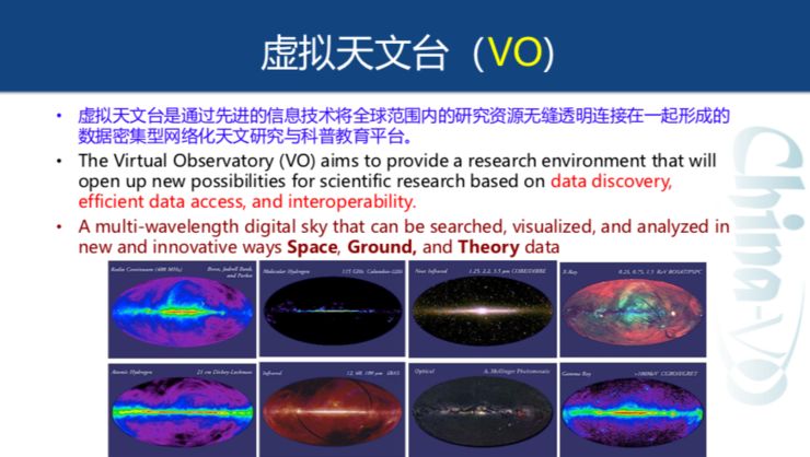 「虚拟天文台」是通过先进的信息技术将全球范围内的研究资源无缝透明连接在一起形成的数据密集型网络化天文研究与科普教育平台。