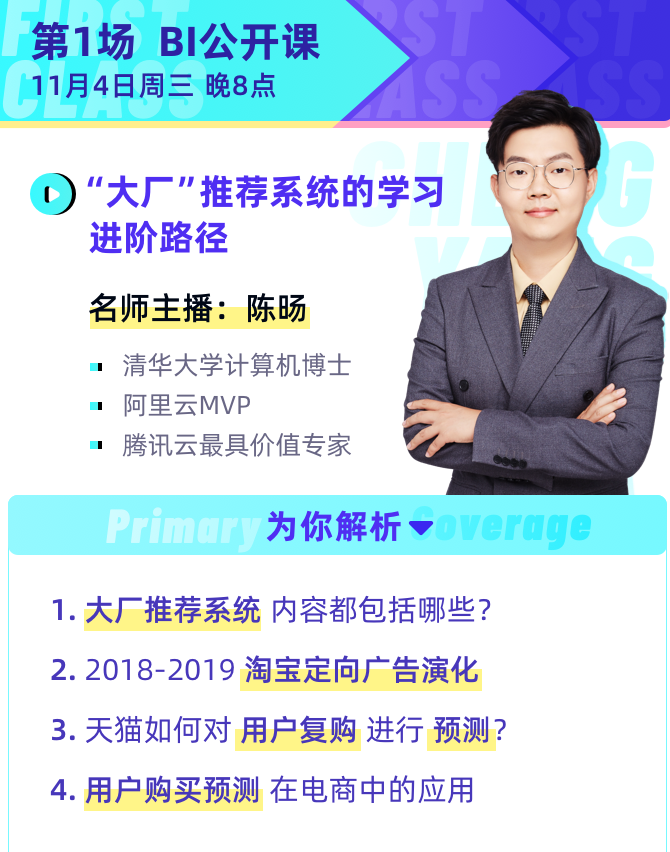 在本节公开课中,陈老师将结合推荐系统在淘宝定向广告演化和天猫用户复购预测两个真实业务场景,向大家讲述推荐系统的学习与应用特点。