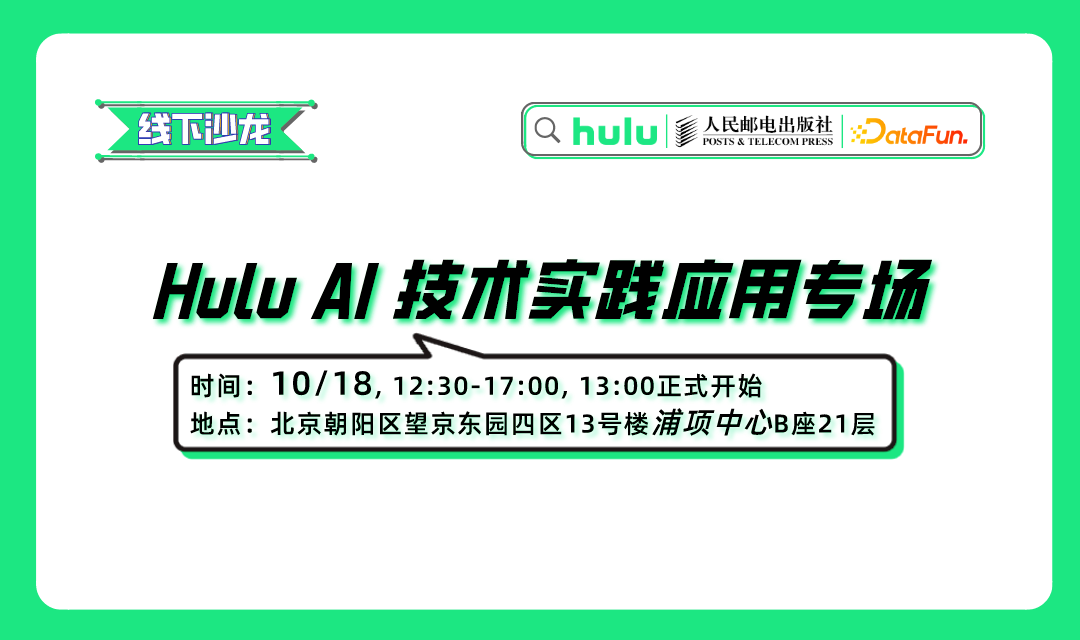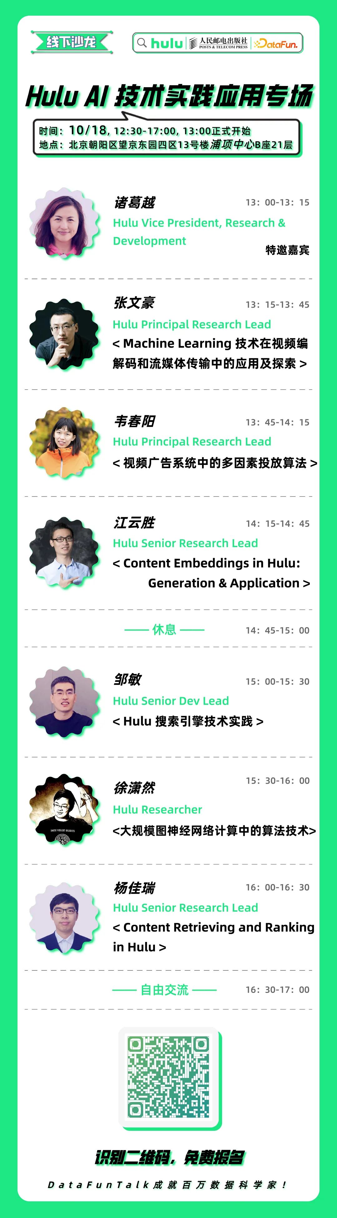 2020年10月18日,12:30-17:00,13:00正式开始,DataFunTalk联合Hulu、人民邮电出版社举办Hulu AI 技术实践应用专场技术沙龙,邀请来自Hulu公司的6位嘉宾,为大家进行主题分享。