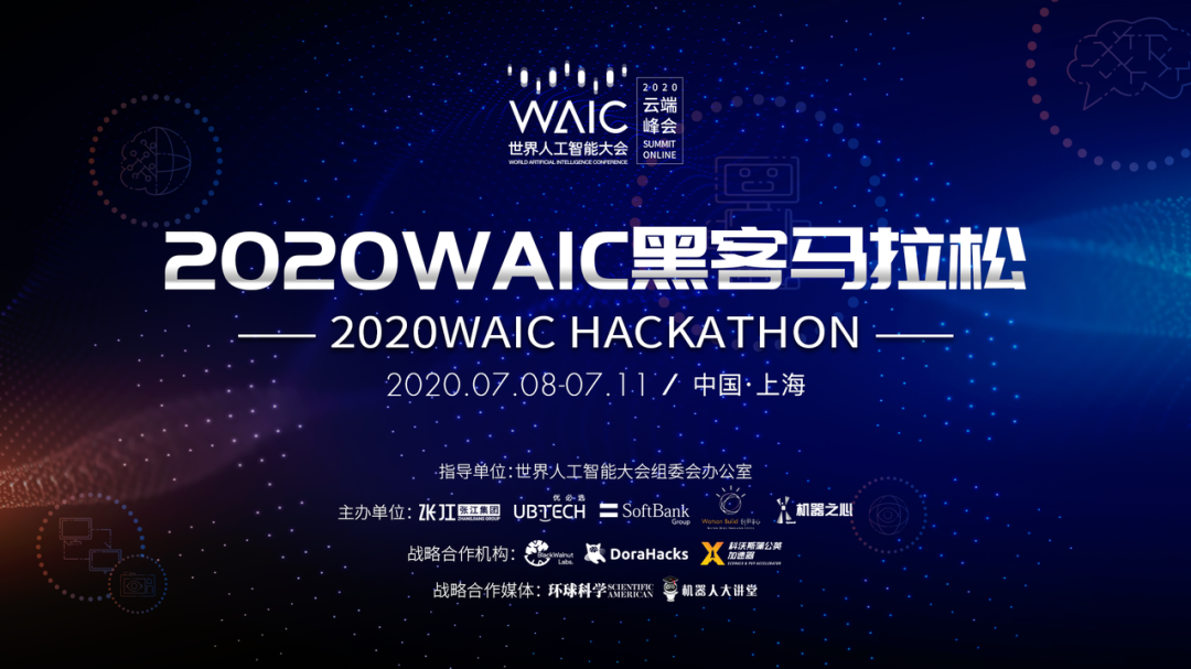 2020 WAIC黑客马拉松由世界人工智能大会组委会主办,张江集团、优必选科技、软银集团旗下软银机器人、Watson Build 创新中心、机器之心联合承办,受到新冠疫情的影响,比赛将于 7月8日 - 11日 期间以远程和小规模线下结合的方式举办,招募全球顶级开发者同台竞技。