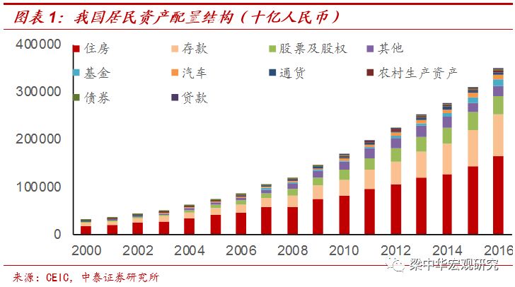 房地产是我国居民最主要的配置资产。根据国家金融与发展实验室(NIFD)公布的中国国家资产负债表,截至2016年底我国居民部门总资产有358万亿,其中有164万亿是房产,占比高达46%,接近居民总资产的一半。
