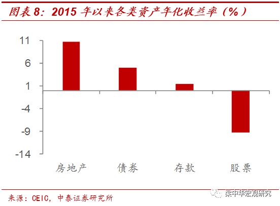 如果将这些都考虑在内,按照NIFD的数据口径,截至2016年底我国居民直接或间接持有的房地产相关资产或有207万亿人民币,占居民总资产的接近60%,即有六成资产配置在了房地产及相关的实体领域。
