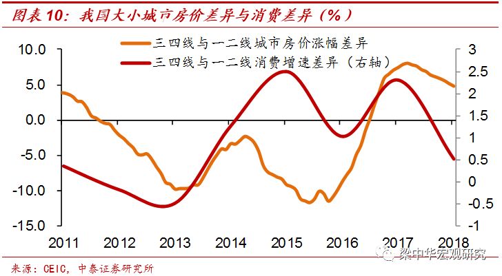 所以我们发现房价涨得多的城市,消费的相对表现也会更好一些。例如在2015-2016年小城市房价大幅回落时,小城市的消费走势也明显落后于大城市。