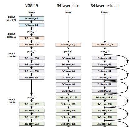 The architecture is similar to the VGGNet consisting mostly of 3X3 filters. From the VGGNet, shortcut connection as described above is inserted to form a residual network. This can be seen in the figure which shows a small snippet of earlier layer synthesis from VGG-19.