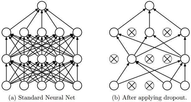 Another problem that this architecture solved was reducing the over-fitting by using a Dropout layer after every FC layer. Dropout layer has a probability,(p), associated with it and is applied at every neuron of the response map separately. It randomly switches off the activation with the probability p, as can be seen in figure 5.