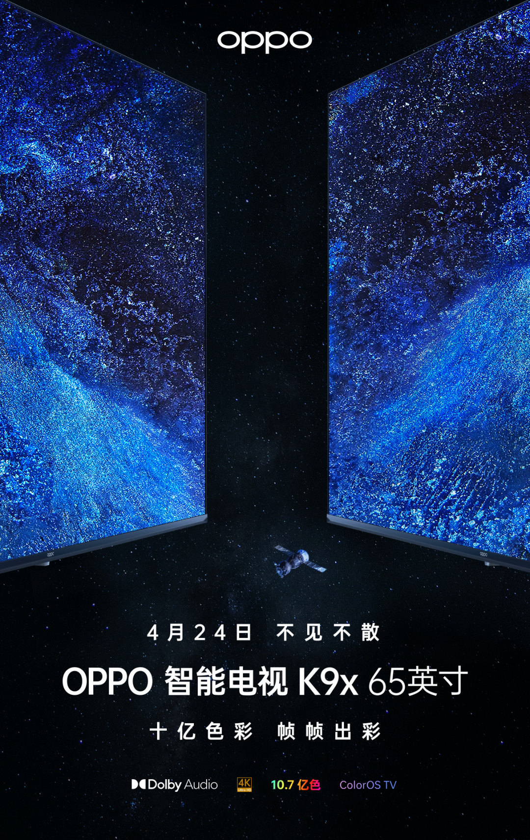 OPPO 昨日上架 65 英寸 OPPO K9X 电视,售价 2499 元,首发到手价 2199 元。根据 OPPO 商城显示,OPPO K9X 电视采用 65 英寸屏幕,屏占比超 95%,4K 分辨率,60Hz 刷新率,支持 10 亿色彩、70% NTSC 色域、自研 AI PQ;搭载联发科 4 核处理器,配备 2GB+16GB 存储空间;拥有双频 Wi-Fi、2 单元 20W 扬声器(支持杜比音效)、蓝牙 5.0;运行新一代 ColorOS TV 系统。