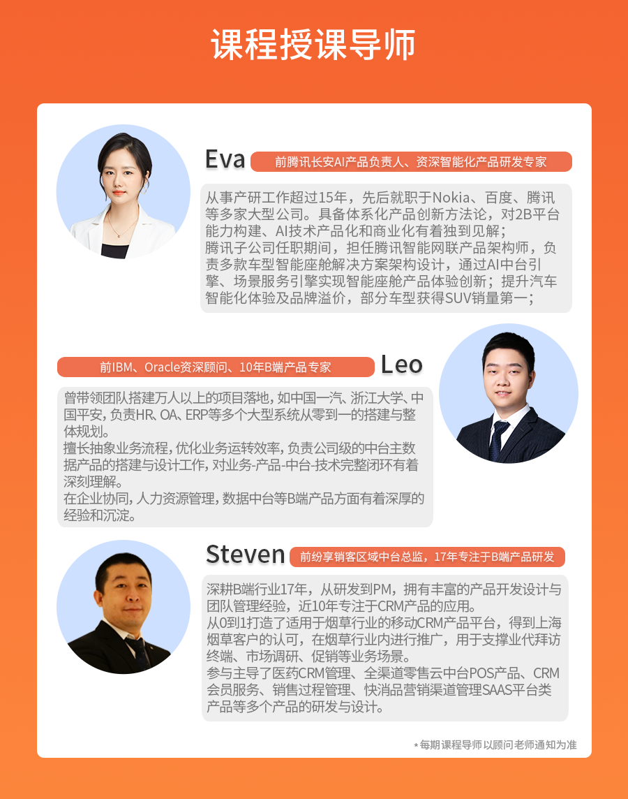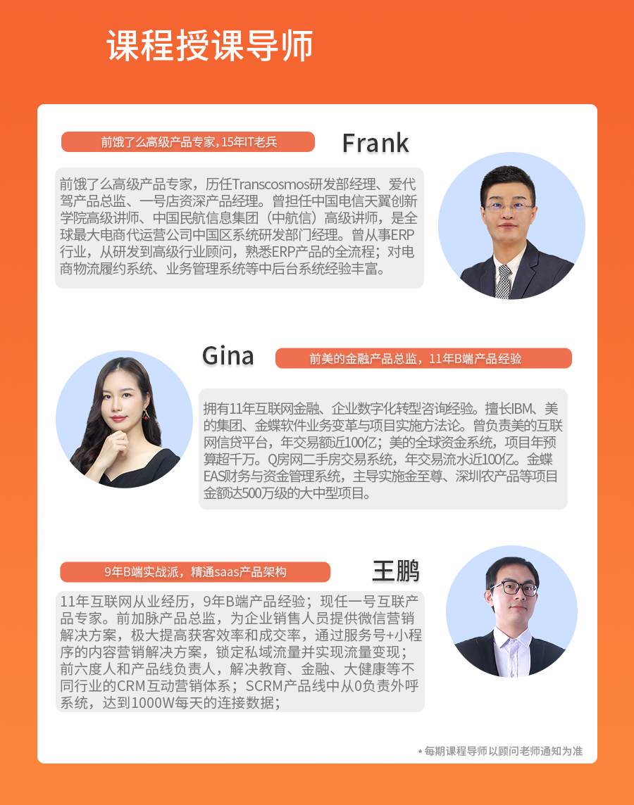 于是,我们在一线互联网公司产品专家/总监以上职位,且有操盘过丰富大体量项目的候选导师中,不断筛选、寻找最合适的人选。