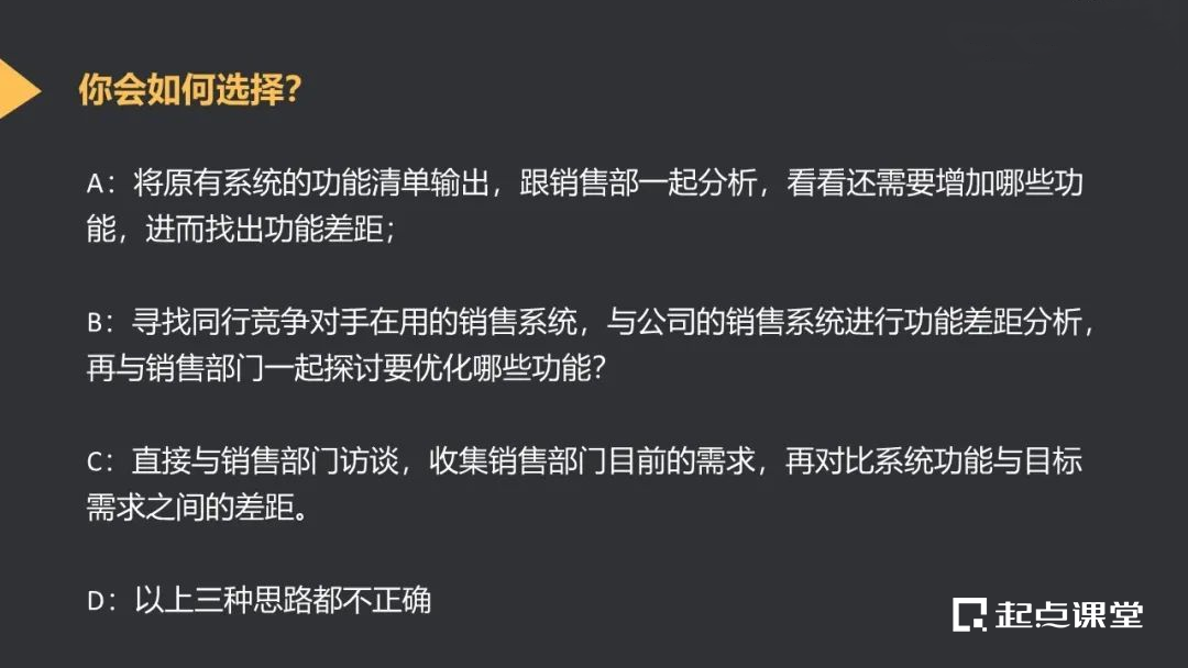 背景:假如你是公司负责销售管理系统的产品经理,因市场环境发生变化,公司销售模式正在进行调整,原有的销售系统已经无法满足业务的需求,须有迭代升级或重构,具体方案需要IT产品与销售部门深入沟通和对比后才能决策。