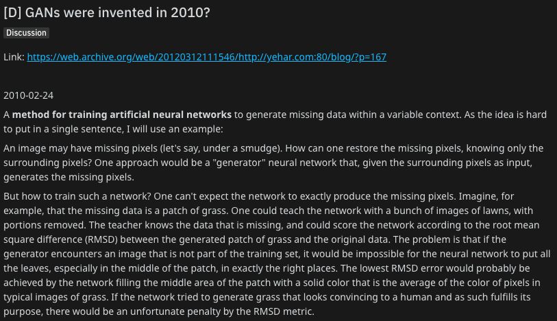 https://www.reddit.com/r/MachineLearning/comments/bnqm0p/d_gans_were_invented_in_2010/