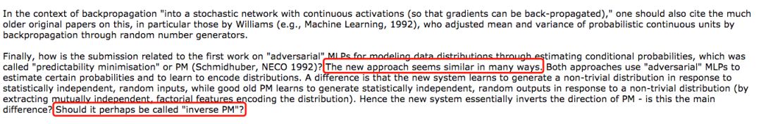 为此,Schmidhuber和Ian不仅在邮件中展开了激烈的争论,甚至在2016 NIPS大会上,趁Ian正在做GAN的tutorial的时候,Schmidhuber站起来打断演讲。首先介绍了一下自己92年提出的PM模型,介绍了PM模型的原理和实现过程等等,然后反问Ian如何看待GAN和PM的相似点。