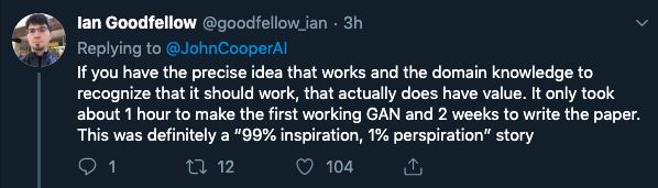 Ian也在下面回复,从侧面认可“做永远比说有价值”:如果你有确切的想法可行,并且领域知识能够认识到它应该有效,那实际上就确实有价值。制作第一个能运作的GAN只花了大约1个小时,写论文只花了2个星期。这绝对是一个“99%灵感,1%汗水”的故事。