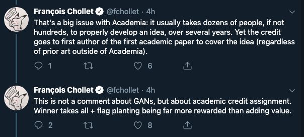 Keras之父François Chollet回复说:这对学术界来说是一个大问题。通常需要数十人(如果不是数百人),花费很多年心血才能正确地发展一个想法。然而,荣誉要归功于第一篇学术论文的第一作者(无论学术界之外的现有技术如何)。