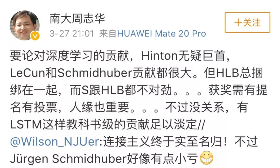 比如今年图灵奖的归属,包括南京大学人工智能学院院长周志华教授在内的许多学界人士,均发出质疑为什么图灵奖得主不是LSTM之父Jürgen Schmidhuber?他也是深度学习领域的大家啊。