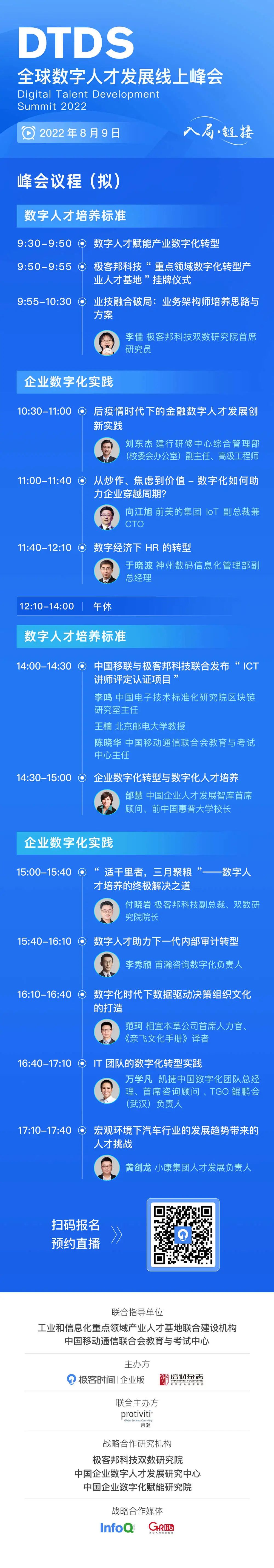8 月 9 日,DTDS 全球数字人才发展线上峰会 邀请政府和产业的权威,金融、汽车、制造、ICT、零售、互联网、风控审计企业的数字化负责人,IT 团队管理者,数字化组织和人才发展专家同台交流,从多维视角分享数字化先行者如何通过人才数字能力转型应对组织转型、业务转型、技术转型带来的考验。您将收获: